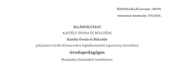 ÁLLÁSPÁLYÁZAT – Óvodapedagógus munkakör/feladatkör betöltésére.